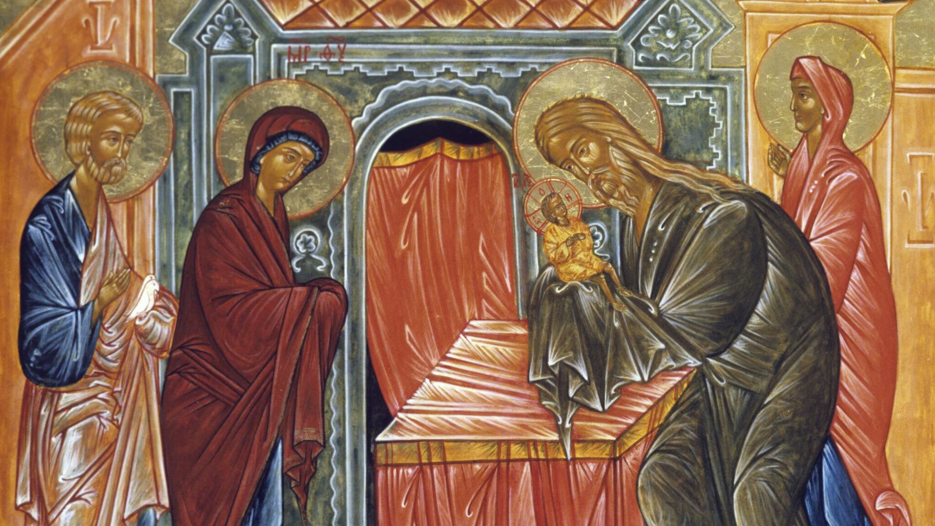 В те дни в Иерусалиме жил праведный старец Симеон, известный своей благочестивой жизнью и духовной прозорливостью. Ему было даровано откровение, что он не умрёт, пока не увидит Мессию, обещанного Спасителя мира. Когда Пресвятая Богородица и святой Иосиф пришли в храм с младенцем Иисусом, чтобы исполнить предписанный обряд, Симеон также пришёл туда в тот самый момент, ведомый Божьим промыслом.